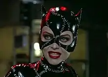 Catwoman is portrayed by Michelle Pfeiffer in the 1992 feature film Batman Returns. Re-created by Daniel Waters, the character is based on the Selina Kyle from "Catwoman: Her Sister's Keeper".[20] Other actresses including Madonna (who was the frontrunner for the role), Jennifer Beals, Lorraine Bracco and Demi Moore were all linked to the role, and actress Sean Young campaigned heavily to get it (even turning up to Warner Bros. Studios in a homemade Catwoman suit). When it was suggested to Tim Burton that Michelle Pfeiffer was interested, something clicked to the producers thinking "She's perfect. She also could be both Selina Kyle and Catwoman."[21][22]