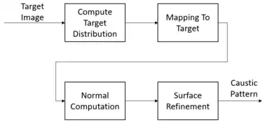 Inverse graphics is a method of observing the data from an image and inferring all possible properties including 3D geometry, lighting, materials, and motion in order to generate a realistic image.[15] In conventional computer graphics, to render an image with desired appearance and effects, it is given all the relevant properties/characteristics. This could be described as the forward method. On the contrary, in caustic design, the properties and characteristics of objects (especially the material surface) are not trivial. The given constraint is the target image to obtain. Therefore, the goal is to obtain its properties and characteristics by observing and inferring the target image. This can be considered the inverse/backward method.