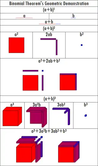 For positive integers, this proof can be geometrized:[2] if one considers the quantity xn as the volume of the n-cube (the hypercube in n dimensions), then the derivative is the change in the volume as the side length is changed – this is xn−1, which can be interpreted as the area of n faces, each of dimension n − 1 (fixing one vertex at the origin, these are the n faces not touching the vertex), corresponding to the cube increasing in size by growing in the direction of these faces – in the 3-dimensional case, adding 3 infinitesimally thin squares, one to each of these faces. Conversely, geometrizing the fundamental theorem of calculus, stacking up these infinitesimal (n − 1) cubes yields a (hyper)-pyramid, and n of these pyramids form the n-cube, which yields the formula. Further, there is an n-fold cyclic symmetry of the n-cube around the diagonal cycling these pyramids (for which a pyramid is a fundamental domain). In the case of the cube (3-cube), this is how the volume of a pyramid was originally rigorously established: the cube has 3-fold symmetry, with fundamental domain a pyramids, dividing the cube into 3 pyramids, corresponding to the fact that the volume of a pyramid is one third of the base times the height. This illustrates geometrically the equivalence between the quadrature of the parabola and the volume of a pyramid, which were computed classically by different means.