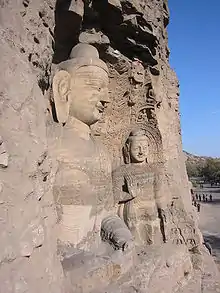 The interiors of Central and East Asian cave temples are usually completely covered with groups of carved stone figures, reliefs, and ornaments. From this rich array of figures, larger configurations in niches stand out, especially the colossal statues of the seated Buddha as world ruler and his standing companion figures that dominate in Yungang and Longmen.[34]