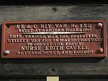 The Cavell Van was designed by Richard Maunsell.[2] It was built to Diagram 960 by the South Eastern and Chatham Railway at Ashford Works in 1919 and was the prototype Parcels and Miscellaneous Van.[3] In 1919, it was used for the carriage of the bodies of two people killed during the First World War – Edith Cavell and Charles Fryatt. It carried the body of The Unknown Warrior in 1920.[4]