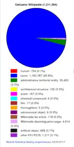 An analysis of Cebuano Wikipedia content on Wikidata in July 2015 showed that of the then 1.21 million articles, 95.8 percent are living beings and biological species (1,160,787) and 3.3 percent are cities and communities (39,420).[17]