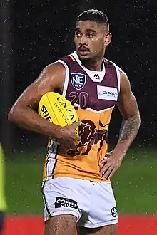 He was drafted by the Brisbane Lions with their fourth selection and twenty-fourth overall in the 2016 national draft.[2] He made his debut in the fifty-two point loss against Richmond at the Gabba in round four of the 2017 season.[3] On 24 May 2017, it was announced that he would wear number 67 on his jersey, rather than his usual 20, for the round 10 Sir Doug Nicholls Indigenous Round game against Collingwood. This was to commemorate the 1967 referendum (which allowed Indigenous Australians to be counted with the general population in the census and thus be treated separately in legislation).[4] However, he was not picked to play in the game.