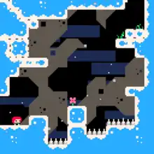 The base game is made up of eight chapters divided into multiple single-screen challenges, with checkpoints in between screens.[3][7] Chapters contain branching paths leading to optional challenges and hidden collectibles.[7][3] The collectibles range from strawberries[12][4][2] to crystal hearts that unlock certain gates.[10] Certain chapters contain a boss character.[7] Each chapter has a "B-side" level that reuses mechanics from the main level to create a more difficult experience.[6] B-side levels can be unlocked by locating the hidden cassette tape in its corresponding level.[8] After completing all eight B-sides, "C-side" levels are unlocked that are shorter in length but with increased difficulty.[13] The Farewell expansion adds a new chapter that excludes B-side options and collectible strawberries,[14] and adds grabbable jellyfish that function as a parachute, exploding pufferfish that can launch Madeline, and "double-dash" gems that give Madeline two dashes when collected.[15][16][17]