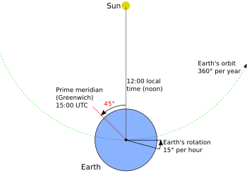 Presently, layperson calculations of longitude can be made by noting the exact local time (leaving out any reference for daylight saving time) when the Sun is at its highest point in Earth's sky. The calculation of noon can be made more easily and accurately with a small, exactly vertical rod driven into level ground—take the time reading when the shadow is pointing due north (in the northern hemisphere). Then take your local time reading and subtract it from GMT (Greenwich Mean Time), or the time in London, England. For example, a noon reading (12:00) near central Canada or the US would occur at approximately 6 p.m. (18:00) in London. The 6-hour difference is one quarter of a 24-hour day, or 90 degrees of a 360-degree circle (the Earth). The calculation can also be made by taking the number of hours (use decimals for fractions of an hour) multiplied by 15, the number of degrees in one hour. Either way, it can be demonstrated that much of central North America is at or near 90 degrees west longitude. Eastern longitudes can be determined by adding the local time to GMT, with similar calculations.