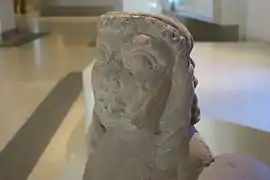 The head, with an incised beard and hair falling into three braids on the upper legs, gives way to a brief chest and an equine body which lacks a tail. The arms are missing and also the legs below the knees; hands are visible on the hips.[2]