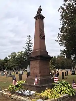 The cemetery's exact date of founding is not recorded, with its first appearance on a map in 1750, and its oldest grave marked 1738. The town apparently began management of it in 1754, a point at which may have been enlarged. The grounds underwent several expansions to reach their present size, and further growth is contemplated. In the 1830s a receiving vault was added, and an iron fence was installed around three sides of the perimeter in 1900. The Soldiers' Monument, a red sandstone obelisk which stands prominently at the cemetery entrance, was placed in 1866.[2]