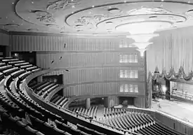 After 21 years of operation, the Center Theatre was demolished in 1954 and replaced with a 19-story addition to the U.S. Rubber Company Building. The final production at the theatre was the New York-portion of the 1954 Academy Awards, when Audrey Hepburn won Best Actress for Roman Holiday.[5] During the demolition process, the U.S. Rubber Building above it was put on temporary stilts, with the offices above the former theater still being occupied during the demolition process.[7] Doors, lamps, and other furnishings were sold off to the Cherry Lane Theatre in the West Village.[8] Bob Jones University purchased the stage lifts and turntables from the Center Theatre and reassembled them in its Rodeheaver Auditorium, where the mechanisms are still in use today.[9]
