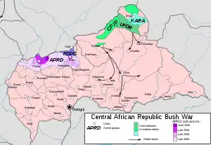The Central African Republic Bush War[5] was a civil war in the Central African Republic which lasted from 2004 to 2007 between Union of Democratic Forces for Unity (UFDR) rebels and government forces. The rebellion began after François Bozizé seized the nation's presidency in 2003. Actual fighting began in 2004.[6] Around 10,000 people were displaced because of the civil unrest.[1]
