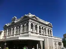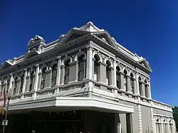 Central Chambers was built by the contractor Richard Rennie, who had previously built Owston's Buildings in 1903 and the National Hotel in 1895.[3] It was designed by architect Frederick William Burwell who also designed the Victoria Pavilion, Sail and Anchor Hotel, Fowler's Warehouse, Owston's Buildings and Marmion House.[4] The superintendent of works was W. Sefton. The clients for the building were George and William Silas Pearse, and the building originally contained a range of shops and offices.[5] The building is constructed of brickwork throughout resting on a basecourse of rusticated bluestone.[5] It features a decorative façade on the first floor exterior featuring Central Chambers in stucco. The paired windows feature stucco and pilastered and stucco arches with elaborate decorations above and piers below. The parapet has a balustrade and five highly decorative pediments extending below. The original entrance is still located between the shops and features stained glass leadlight sidelights and French doors between.[1] Originally the entrance hall and vestibule lead to the shops and offices, the staircase being made from polished jarrah. Tiles in different colours have been used for dados, corridors and decorations. The building is embellished in the Italian Renaissance style.[5]