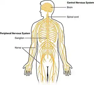![]() Schematic diagram showing the central nervous system in yellow, peripheral in orange | |