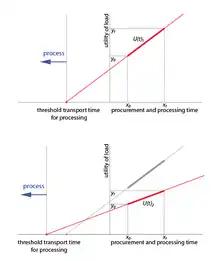 With values for the utility and time of processed and unprocessed loads , we can solve for . The right hand side of the equation is the proportion of relative utility*time to utility. Two conditions must be satisfied. First, the processed load must have higher utility than the unprocessed load. Second, the return rate of the unprocessed load must be at least as good as the return rate for the processed load. Formally,