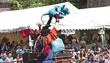 The Pentecôte du Roi Arthur is a medieval spectacle with jonglerie, storytellers, camps, storytelling, camps and other displays such as historical reenactment and living history.[39] As the name suggests, it coincides with the date of Pentecost. It is a celebration of spring and the adventures and encounters which it brings,[40] but most importantly (according to Ouest-France) it is an evocation of King Arthur's coronation day (as described by Robert de Boron in the 13th century) and his commitment to the Church. It was also on Pentecost that the Holy Grail appeared to the Knights of the Round Table.[41]