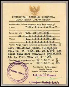 The Certificate of Citizenship of the Republic of Indonesia (Indonesian: Surat Bukti Kewarganegaraan Republik Indonesia; abbreviated SBKRI) was an identity card establishing citizenship in the Republic of Indonesia.