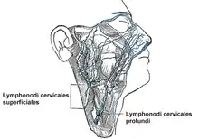 Cervical lymphadenopathy refers to lymphadenopathy of the cervical lymph nodes (the glands in the neck). The term lymphadenopathy strictly speaking refers to disease of the lymph nodes,[1] though it is often used to describe the enlargement of the lymph nodes. Similarly, the term lymphadenitis refers to inflammation of a lymph node, but often it is used as a synonym of lymphadenopathy.