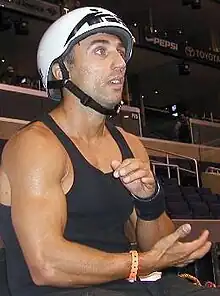 Cesar Mora is an Australian professional vert skater and a pioneer in vert skating. Cesar is the only vert skater to compete in all ten of the first X Games. In 1998, he won vert gold, and has two vert silver medals ('95, '99) as well as a bronze ('00).[1] A number one ranked skater and world champion several times, he skated for Roces Skates from 1994 to 1998 before switching to K2 Skates from 1999 to 2004. Born in Madrid, Spain, on February 3rd, and having lived most of his life in Sydney Australia, Cesar represented Australia in soccer at a youth level, traveling to the US and England before returning to his city of birth Madrid and training with the Spanish football club Rayo Vallecano for several months, which at the time were in the 4th division of the Spanish league. He returned to Sydney and started skating at Bondi Beach, where he practiced his skills on the ramp and began an international skating career. Always "Creative, explosive and exciting to watch", he promoted a drug-free lifestyle. Cesar also practiced art, illustration, creative drawing, and graphic design. In 2003 Cesar headlined a video game called Rolling, being included with some of the most well-known skaters in the world at the time. Sometimes referred to as the "King of Vert", in 1998 he was the first skater in history to land a 1080°, and later that year achieved a reverse 1260°. Throughout his career, Cesar managed to avoid major injuries until the end of 2000, when performing at the Melbourne Planet X Games, he fell and broke his left arm and wrist. That year he took a short hiatus focusing on healing his injuries. Once his confidence returned Cesar's usual tricks of spins, flips, and airs were performed again. For many years he was known for his backflips, always being described as a "crowd pleaser". Cesar, ever the showman, never left a ramp without giving his all, whether it be the X Games or a small show in Peru where the ramp may have been less than appropriate. He wanted to leave the kids and fans with something special and signed autographs. Cesar's position as a role model, made him wear a helmet, because when he started his first tour in the US he never liked wearing a helmet, and was told "no helmet no skate". As a skater with a respectable list of achievements, he had a successful time on tour and was grateful to anyone who supported him.