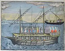 When the Portuguese first came to Malacca, they found a large colony of Javanese merchants under their own headmen; they were manufacturing their own cannon, which is deemed as important as sails in a ship.[26] Duarte Barbosa recorded the abundance of gunpowder-based weapons in Java ca. 1514. The Javanese were deemed as expert gun casters and good artillerymen. The weapon found there include one-pounder cannons, long muskets, spingarde (arquebus), schioppi (hand cannon), Greek fire, guns (cannons), and other fire-works.[27]: 254 [28]: 198 [29]: 224 When Malacca fell to the Portuguese in 1511 A.D., breech-loading swivel guns (cetbang) and muzzle-loading swivel guns (lela and rentaka) were found and captured by the Portuguese.[30]: 50 In 1513, the Javanese fleet led by Pati Unus, sailed to attack Portuguese Malacca "with much artillery made in Java, for the Javanese are skilled in founding and casting, and in all works in iron, exceeding what they have in India".[15]: 162 [31]: 23