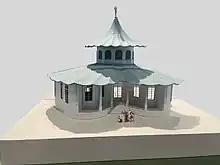 The pavillon du Trèfle, also known as the maison du Trèfle was constructed in 1739 by Emmanuel Héré de Corny. Inspired by Chinese pagoda architecture, this Chinoiserie pavilion was entirely made out of wood. It received its name "trèfle", meaning "clover leaf", due to its trefoil-layout. The silhouette of its roof was inspired by Chinese architecture. The building was made out a round salon with about seven metres in diameter, with a tiled floor. It was decorated with painted scenes with Chinese motifs and painted scagliola. It was furnished to be a comfortable place with a sleeping chamber with an alcove, a bathroom and a garde-robes. The upper floor was a belvedere lookout point where you could see the "bas bosquets", also called nouveaux bousquets,[21] created under Stanislaus, in between the river Vezouze and the canal.[22][23]