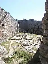 There remains no trace within the present-day ruins, neither of the first fortress which was abandoned before the 13th century (Montsegur I), nor of the one which was built by Raymond de Péreille around 1210 (Montsegur II)..." (Il ne reste aucune trace dans les ruines actuelles ni du premier château qui était à l'abandon au début du XIIIe siècle (Montségur I), ni de celui que construisit Raimon de Pereilles vers 1210 (Montségur II)...)[5]