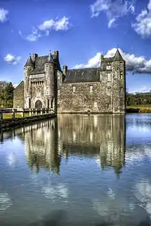 The Château de Trécesson is a medieval castle in the Brittany region of France. It is located in the commune of Campénéac near the Paimpont forest and on the edge of the military camp of Coëtquidan. It is a private property. It has been listed since 2012 as a monument historique by the French Ministry of Culture.[1]