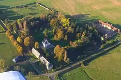 Château de la Motte takes its name from the small-forested rise next to the current house, called a motte ("clod of earth" in Old French). The small mound is the remains of a Viking/Norman motte-and-bailey castle (motte castrale, motte féodale in Old French). Mottes were made throughout France and Europe from the 10th century until the early 13th century, with many sites carrying the title of La Motte, Les Mottes, Forêt de la Motte, or Château de la Motte.[1]