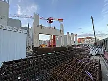 In November 2019, the tunnel boring machine, Ellen, reached the station, completing the tunneling at the station.[8] Civil works, including the excavation of the station box, were completed in end-May 2022. The installation of infrastructure such as escalators and lifts, networks (electrical, telephony, plumbing), painting, and construction of the surface building will take place over the next two years.[12]