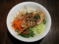 ![]() Chạo tôm with bún (rice vermicelli), mung beans, shredded carrot and lettuce, mint, and crushed peanuts | |