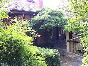 Chadwick House is found at 32-34 the Eyrie in Eaglemont, Melbourne.[1] The house is one of three houses which were built on land purchased by Desbrowe-Annear‘s father-in-law and the houses are still found today on The Eyrie and adjoining Outlook Drive. The two other houses of very similar design built by Desbrowe-Annear. The three houses were sited to take advantage of the vista, ventilation, sunshine and a ‘healthy atmosphere’ which were considered important to the design. Each of the houses is sited increasingly further back from the street so as not to block the view of the other.
