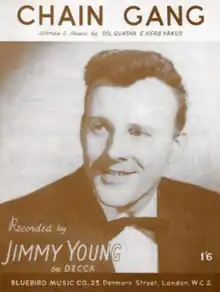 Jimmy Young's version of "Chain Gang", recorded with Bob Sharples and His Music, was released as a single in the United Kingdom in March 1956. The single marked a change in style for Young, who was best known for his ballad recordings.[12] The recording employs a slapback echo effect on Young's vocal.[13] His last line is treated with a longer, sustained tape delay.[13]