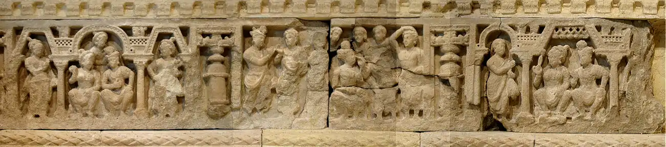 The left part of the narrative frieze represents the Buddha in a conventional scene (the visit to the Brahman).