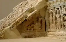 The second tier is sided by triangular stair risers, which depict a Hellenistic winged Ketos sea monster, a motif often seen with such a function in Greco-Buddhist art. It is thought that the Ketos symbolizes the transition to the other world after death. Some of the Buner reliefs are much better preserved and give a better picture of the original Ketos design.
