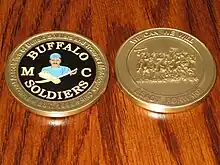 Another organization in which challenge coins have gained popularity is the "National Association of Buffalo Soldiers and Troopers Motorcycle Club" (NABSTMC), which has over 85 chapters totaling over 2,000 members. The coin must be earned by the members for a noteworthy accomplishment.[37]