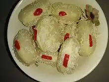 Cham cham, Chomchom or chum chum (Bengali: চমচম) is a traditional Bengali sweet, popular throughout the Indian subcontinent. The sweet comes in a variety of colors, mainly light pink, light yellow, and white. It is coated with coconut or mawa flakes as a garnish.