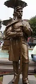 Since people from Chambersburg had relatives on both sides during the war, and the war devastated the town, the town event also became a part of the town's identity. On July 17, 1878, 15,000 people attended dedication of Memorial Fountain in the town's center, which honors the Civil War soldiers, and later Chambersburg's fighters in other wars. A statue of a Union soldier stands next to the fountain, facing south to guard against the return of southern raiders.