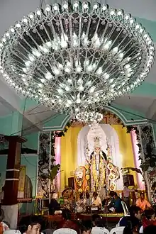 Nandadulal Temple built in 1740 by Indranarayan Roychoudhury presents an excellent example of ancient Indian sculptures. There are many fascinating temples devoted to Kali, Shiva and other deities which show marks of brilliant craftsmanship and artistic taste. The temple's old idol of lord Krishna was thrown away into the pond behind the temple by a general. Later the pieces of the idols were fished out and submerged in varanasi. It is built in the do chalha style.