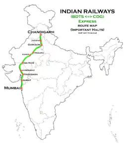 The 22451 / 22452 Chandigarh–Bandra Terminus Superfast Express runs from Chandigarh Junction via Ambala Cantonment Junction, Gurgaon, Rewari Junction, Phulera Junction, Ajmer Junction, Abu Road, Ahmedabad Junction, Vadodara Junction, Surat, Borivali to Bandra Terminus and vice versa.