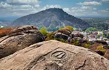 ![]() Medieval stone relief at Digambara pilgrimage site Shravanabelagola, Karnataka. It has been interpreted as Bhadrabahu and Chandragupta Maurya,[1] but some disagree.[2] | |