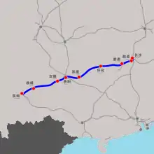 Changsha–Kunming high-speed railway (simplified Chinese: 长昆高速铁路; traditional Chinese: 長昆高速鐵路; pinyin: Cháng-Kūn Gāosù Tíelù) is a China Railway High-speed line connecting Changsha and Kunming, respectively the provincial capitals of Hunan and Yunnan. It is the western end of a larger rail project, the Shanghai–Kunming high-speed railway, which is one of the Ministry of Railways's strategic four east–west high-speed railways, and an integral part of the long-term railway network plan.
