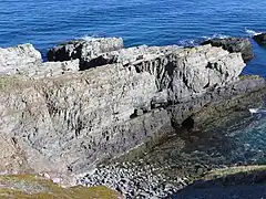 ![]() Ediacaran–Cambrian boundary section at Fortune Head, Newfoundland, in the Chapel Island Formation. The darker units constituting the bottom 2–3 m of the outcrop correspond to Unit 1; the GSSP lies a couple of meters into Unit 2. | |