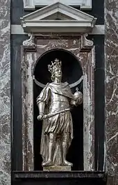 The chapel has eight sculptures of rulers that stand in marble niches in the four corners. At about 2.2 m (7 ft 3 in) in height, the sculptures are taller than life size.[11] They are carved from wood and plated in silver.[12] They were carved with particular attention to individualized details: attributes of power, clothes, facial details, hand gestures, and poses (they are turned a bit to the left or the right so they face the main altar better).[13] The author, date of creation, and identity of the figures are unknown and are subject to speculation by art historians.