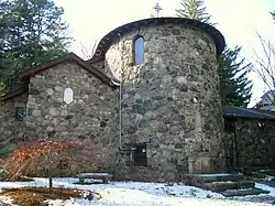 The chapel is a two-story roughly rectangular stone structure, oriented east-west, with a gabled roof. The stone used in its construction was locally gathered, and integrates a number of unusual features, including a paving stone from the Cambridge sewer system, a 16th-century madonna and child figure executed in Carrara marble, and ecclesiastical wood carvings. It has a gracefully curved apse, and a rose window in the gable at the western end.[2]