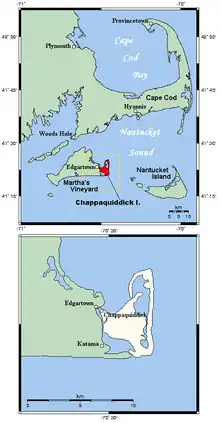 Chappaquiddick Island gained international attention on July 19, 1969, when the body of Mary Jo Kopechne was discovered inside an overturned Oldsmobile 88 off Dike Bridge in Poucha Pond. The car belonged to U.S. Senator Ted Kennedy, who claimed that he had taken a wrong turn and accidentally driven it off a bridge late the previous night. He did not report the accident to the police for ten hours.[19] A January 1970 judicial inquest into Kopechne's death found that Kennedy's turn toward the bridge was intentional, and he operated his car in a manner "at least negligent and possibly reckless". A grand jury investigation was held in April 1970; no indictments were issued. Dike Bridge was closed until 1995.[20] In 2017, a film based on the incident was released with many scenes filmed on Chappaquiddick itself and in Edgartown.[21]