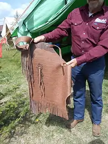 Chaps derive from "zahones", used in southern Spain by hunters and vaqueros to protect the trousers from scratches produced by brushing with plants or branches.[1] They were most likely adopted in Spanish America along with the cowboy culture, and from there they passed into the American Wild West. The earliest form of protective leather garment used by mounted riders who herded cattle in Spain and Mexico were called armas, meaning "weapons". They were essentially two large pieces of cowhide that were used as a protective apron of sorts. They attached to the horn of the rider's stock saddle, and were spread across both the horse's chest and the rider's legs. From this early and rather cumbersome design came modifications that placed the garment entirely on the rider, and then style variations adapted as vaqueros, and later cowboys, moved north from Mexico into the Pacific coast and northern Rockies regions of what today are the United States and Canada. There is also evidence that certain design features may derive from the mountain men, who copied them from the leggings worn by Native Americans.[2] Different styles developed to fit local climate, terrain and hazards.[3] Designs were also modified for purely stylistic and decorative purposes. The time of actual appearance of the garment on American cowboys is uncertain. By the late 1870s, however, most Texas cowboys wore them as the cattle industry moved north.[4] By 1884, the Dictionary of American Regional English notes use of the word in Wyoming, spelled "schaps".[5]