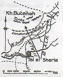Desert Mounted Corps reported at 14:40 that the Australian Mounted Division was "directed on Kh Buteihah" and that the infantry fight was still progressing to the north of Sheria hospital, 1 mile (1.6 km) north of Tel el Sheria.[36] It appeared the Ottoman defenders were reinforcing their line and bringing up an abandoned anti-aircraft gun at 15:00. Twenty minutes later, the 179th Brigade (60th Division) was approaching the left flank.[44] Chauvel had ordered this infantry brigade, which had not taken part in the earlier fighting, to capture the strong Ottoman rearguard, which had stopped the combined light horse and infantry attacks.[20][50] At 17:00 an infantry brigade began to attack the same position the 11th Light Horse Regiment had been attacking from the south. As they moved across the open ground just south of the Wadi Sheria heavy rifle and machine gun fire covered their advance. This attack "relieved the situation", pushed back the Ottoman defenders, who retired as a consequence.[44] The 2/14th and 2/15th London battalions, moved across the Wadi esh Sheria at 17:00 to attack with the bayonet capturing the position just on dark. They captured the Ottoman rearguard position at Sheria and pushed them out of the high ground facing west, suffered 24 casualties during this attack.[20][37][47][Note 4]