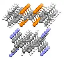 In 1954, charge-transfer salts derived from perylene with iodine or bromine were reported with resistivities as low as 8 ohm·cm.[3] In 1973, it was discovered that a combination tetracyanoquinodimethane (TCNQ) and tetrathiafulvalene (TTF) form a strong charge-transfer complex, referred to as TTF-TCNQ.[12] The solid shows almost metallic electrical conductance and was the first discovered purely organic conductor. In a TTF-TCNQ crystal, TTF and TCNQ molecules are arranged independently in separate parallel-aligned stacks, and an electron transfer occurs from donor (TTF) to acceptor (TCNQ) stacks. Hence, electrons and electron holes are separated and concentrated in the stacks and can traverse in a one-dimensional direction along the TCNQ and TTF columns, respectively, when an electric potential is applied to the ends of a crystal in the stack direction.[13]