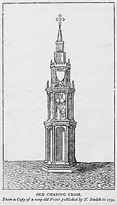 The suffix "Cross" refers to the Eleanor cross made during 1291–94 by order of King Edward I as a memorial to his wife, Eleanor of Castile.[8] At the time, this place comprised little more than wayside cottages serving the Royal Mews in the northern area of today's Trafalgar Square, and built specifically for the Palace of Whitehall (today much of the east side of Whitehall). A debunked folk etymology ran that the name is a corruption of chère reine ("dear queen" in French), but the name pre-dates Eleanor's death by at least a hundred years.[5][9] A variant form in the hazy Middle English orthography of the late fourteenth century is Cherryngescrouche.[5]
