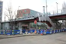 The platforms of Charlemont are located on a steel and concrete beam bridge which crosses the Grand Canal. The waiting shelters are located directly above the canal itself. The advantage of this layout is that the stop can be accessed from either side of the canal: on the south side, a staircase and lift lead from the Grand Parade to the northbound platform. On the north side, staircases lead from each of the platforms to Charlemont Place, but this end does not have step free access. Since the Luas does not have ticket barriers, the bridge can also be used by pedestrians to cross the canal. The bridge has been dedicated to Professor Simon H. Perry, a civil engineer who lead the campaign for a light railway in Dublin.[2] The arrangement of a station on a bridge over water has since been implemented on a much larger scale at London Blackfriars station.