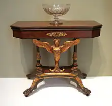 Lannuier's furniture is characterized by its use of architectural motifs–-columns, brackets, pediments, and pilasters; Greek and Roman motifs including anthemions, lyres, caryatids, dolphins, laurel wreaths, and winged figures. Federal motifs associated with the early Republic include eagles and five- or six-pointed stars. Large figures were carved and gilded, while smaller decorative mounts were cast in bronze and gilded.