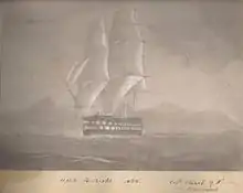 Promoted to rear admiral on 5 August 1861,[5] Elliot became Commander-in-Chief, South East Coast of America Station, with his broad pennant in the second-rate HMS Bombay, in April 1864.[1] This post was based in the Falkland Islands. After HMS Bombay was destroyed by accident in a fire on the River Plate in December 1864, he transferred his flag to the frigate HMS Narcissus.[1]