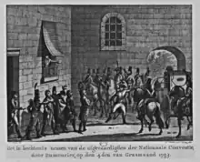 To declare war had always been a prerogative of the king. On 1 February Brissot declared war against King of Great Britain and the stadtholder of the Dutch Republic, not the people. The next day Francisco de Miranda, the only general from Latin America in French service, gave the command of the French forces back to Dumouriez. Although Dumouriez advised the government simply to recognise Belgium's independence, the Jacobins sent several agents.[25] On 7 February Dumouriez appreciated the secret proposals of Van de Spiegel and Baron Auckland: in exchange for recognition of French Republic, France would have to refrain from aggression against other countries.[26] On 15 February, Johan Valckenaer addressed Cambon, the president of the Convention, to give not the committee but Dumouriez all powers to depose regents and restore others to power.[27] Lazare Carnot proposed that annexation be undertaken on behalf of French interests whether or not the people to be annexed so wished.[28] On 17 February 1793, the French troops and the Batavian Legion crossed the Dutch border. Miranda, Stengel, Dampierre, Valence, and Eustace went northeast; Dumouriez and Daendels went northwest. Breda, Klundert, and Geertruidenberg were occupied with an army of Sans-Culottes that lacked almost everything.[29] After the French lost Venlo, Aachen, Maastricht and all the supply at Liège in early March,[30] Dumouriez was ordered to return to Brussels rather than further entering Holland.[31][32] The situation was alarming. Miranda wrote Dumouriez to continue his plan and not return to Belgium.[33]